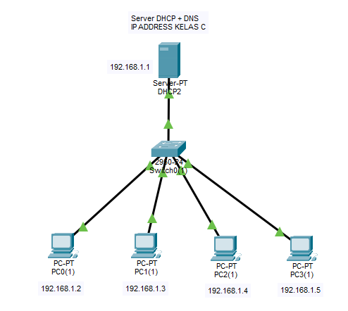 Lalu pada semua PC ubah IP Konfigurasi nya menjadi DHCP, maka nanti nya IP address nya akan terisi otomatis sesuai dengan yang sudah diatur pada server DHCP nya