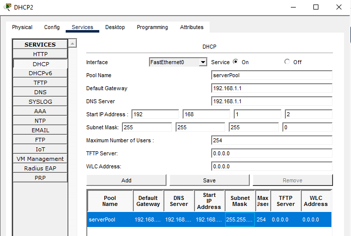 masih di pengaturan server pada menu services bagian DHCP dan DNS masukan seperti berikut: